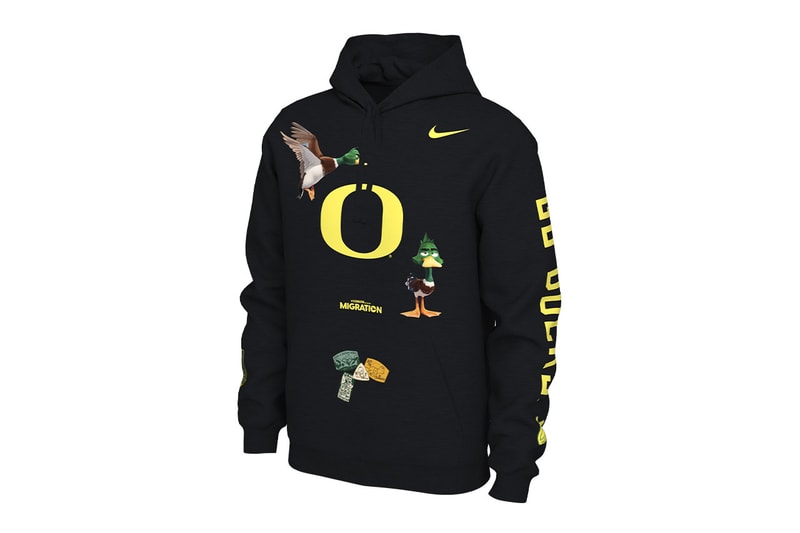 The special-edition collection features a range of apparel items including a long-sleeve shirt, hoodie and three different tees. All of the items feature graphics inspired by the characters from Migration, as well as the University of Oregon’s logo and Nike Swoosh co-branding.