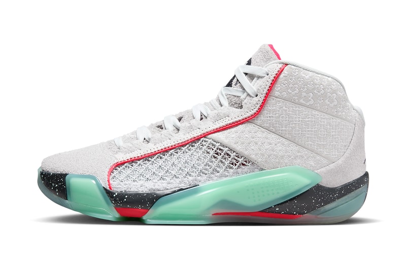 With the Air Jordan 38 serving as 2023’s newest entry in the Air Jordan series, Hachimura is following up on his work on the Air Jordan 37 last year by again nodding to his Japanese heritage. The primarily-gray upper utilizes tonal patterning around the heel of the shoe, including a floral print at the collar. A bright red enlivens the colorway at the piping and interior of the tongue while Hachimura’s logo is stamped at the left shoe’s tongue in black. Looking to the heel, a black Jumpman logo is depicted above the complex sole unit that combines a speckled black with red and a semi-translucent jade green.