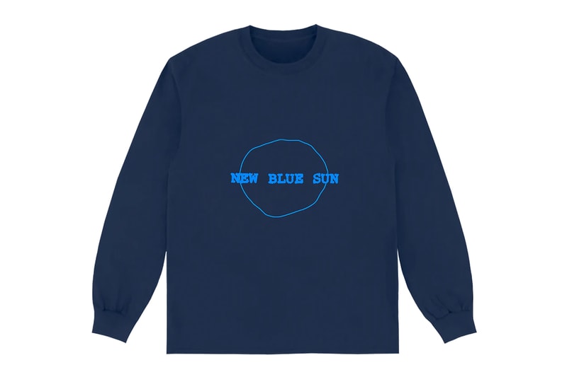 The collaborative capsule includes two pieces with simple graphics. First up is a heavyweight white T-shirt made of 100% recycled cotton that features a puff printed “NBS” logo in black and white, with a blue sun circling around the middle letter. The second piece is a navy longsleeve also crafted with 100% recycled cotton, fronted with the NEW BLUE SUN logo in a lighter shade of blue.