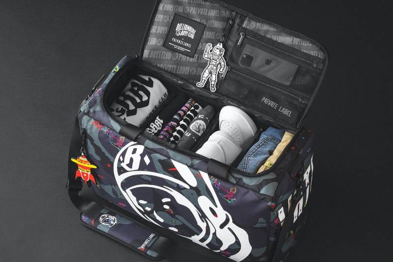 Each of the duffle bags come with three adjustable and removable dividers that help to organize and pack more efficiently. It also comes with one sneaker case or travel case, a padded shoulder strap and two BBC x Private Label collaboration key tags.